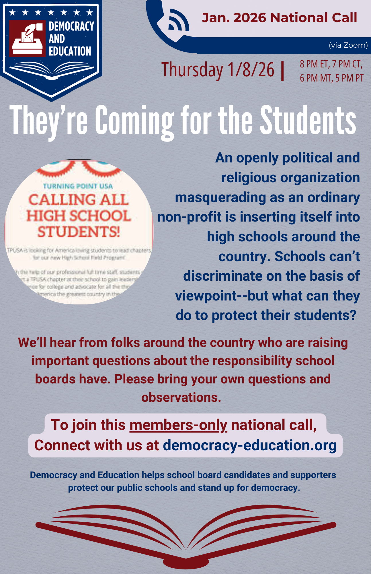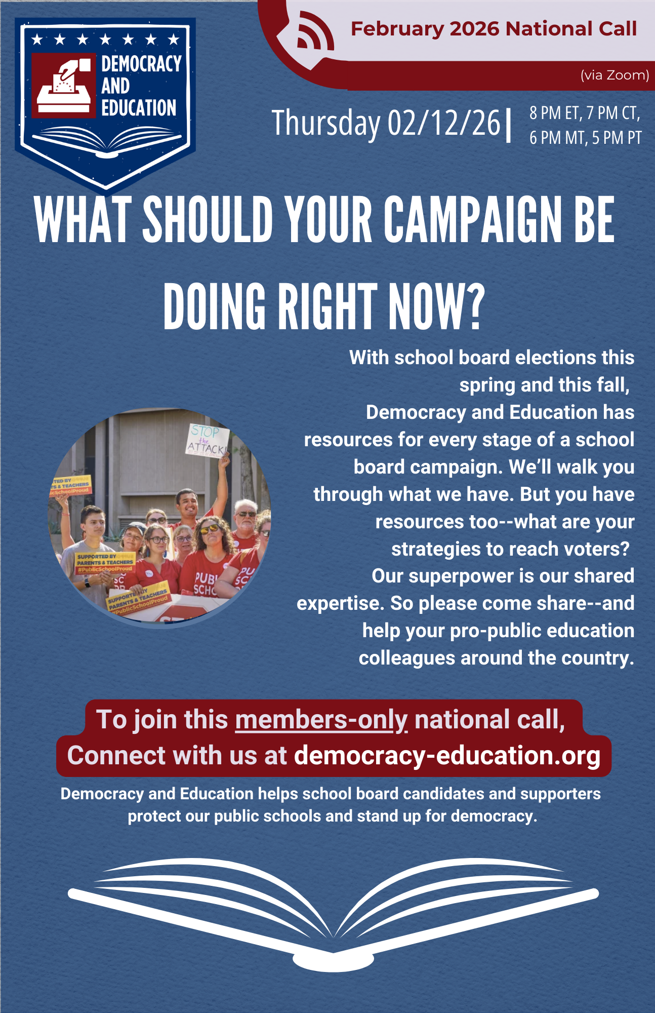 Democracy and Education helps school board candidates and their supporters protect our public schools and stand up for democracy.